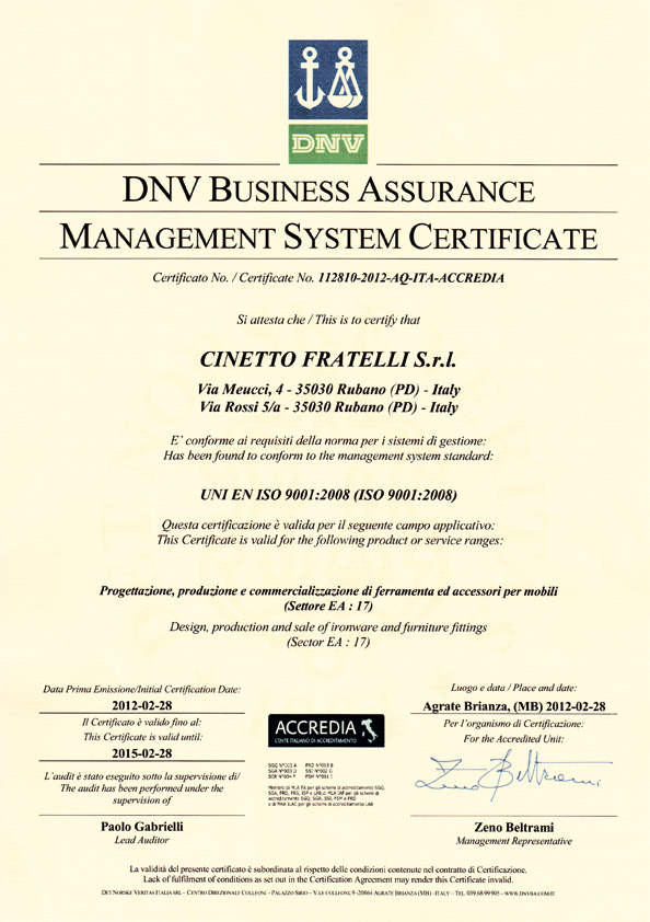 CINETTO f.lli s.r.l. è certificata ISO 9001:2008 dal 2006 con DNV, per la progettazione, produzione e commercializzazione di ferramenta ed accessori per mobili.